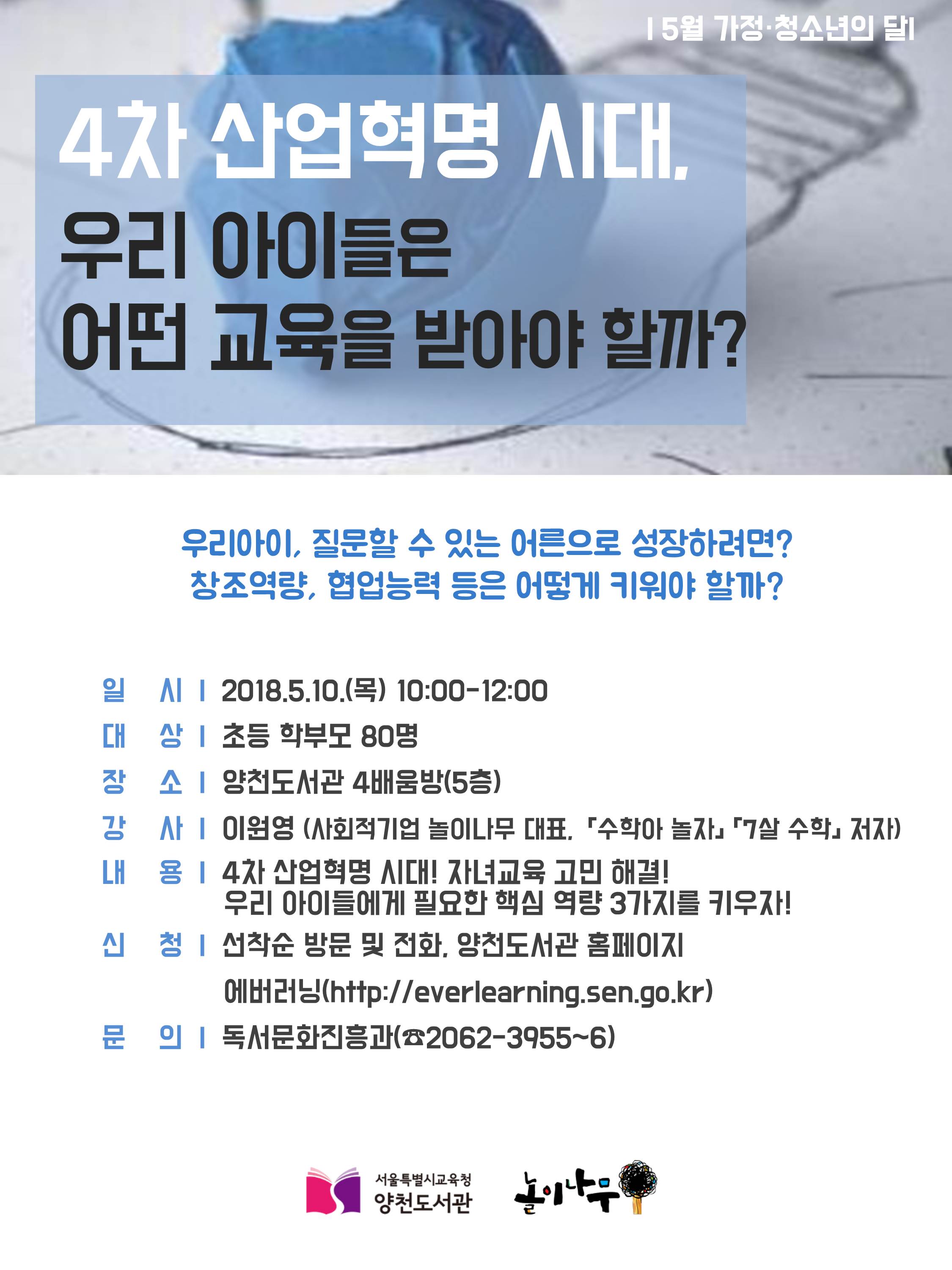 서울특별시교육청양천도서관(관장 이숙희)에서는 5월 가정의 달을 맞이하여 학부모들의 자녀교육에 대한 고민해결과 가정 내 교육을 통한 가족 간 상호소통 증진에 도움을 주기 위하여 <4차 산업혁명 시대, 우리 아이들은 어떤 교육을 받아야 할까?>를 운영합니다. 관심있는 학부모님들의 많은 참여 바랍니다.