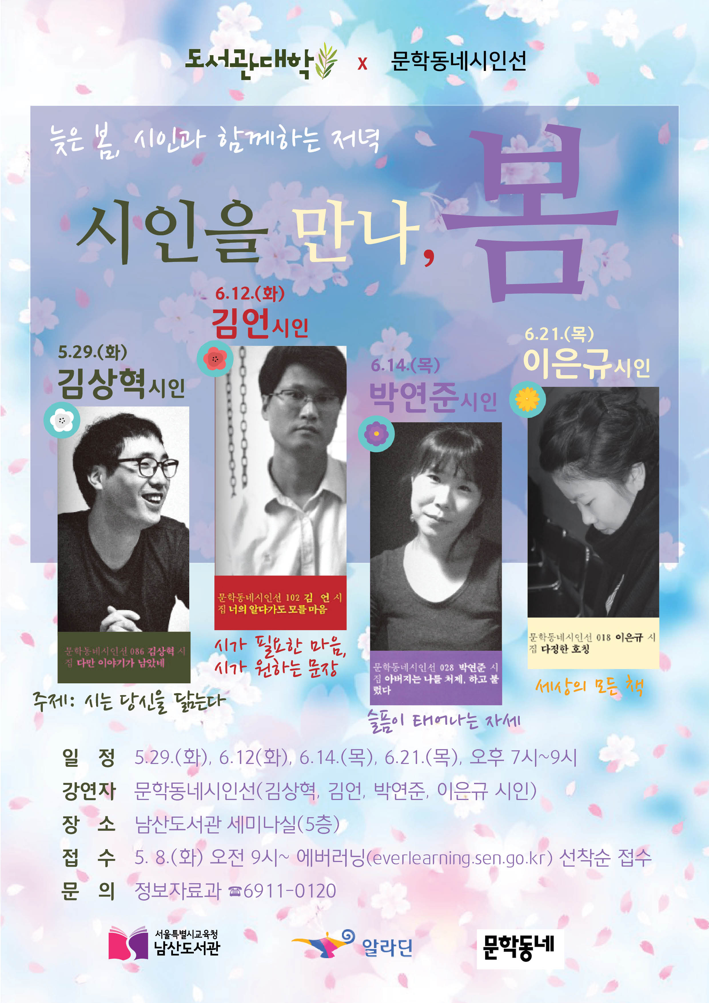 ▢ 서울특별시교육청남산도서관(관장 손영순)은 5월부터 6월까지 '시인을 만나 봄' 강연회를 4회 운영한다.