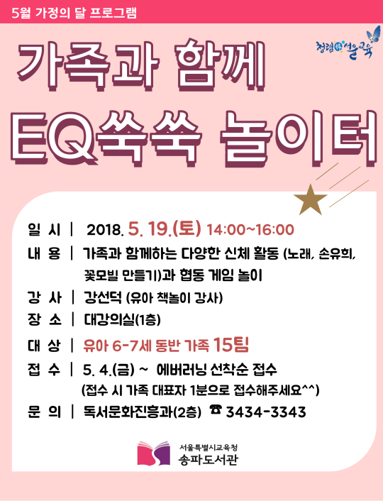 ▢ 서울특별시교육청송파도서관(관장 김선희)은 5월 가정의 달을 맞아 5월 19일 토요일에 6-7세 유아 동반 가족을 대상으로 가족 참여 프로그램 「가족과 함께 EQ쑥쑥 놀이터」를 운영한다.