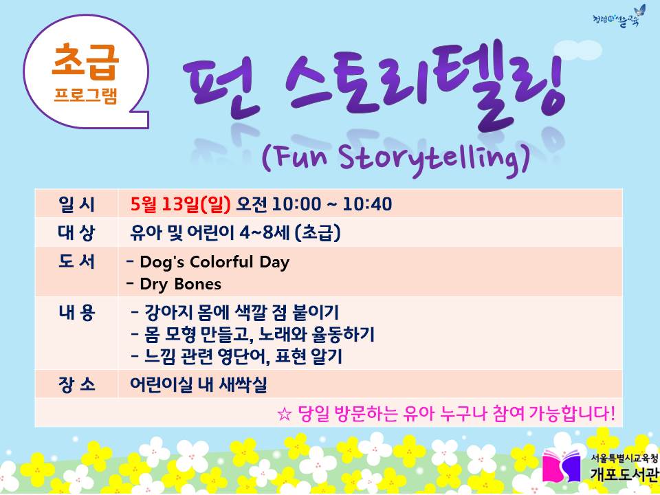 * 5월 13일 일요일 오전 10시부터 개포도서관 성인학습동아리 재능기부로 '펀스토리텔링' 프로그램을 운영합니다. 유아 영어 그림책 스토리텔링과 재미있는 활동놀이를 할 예정이며 참가를 원하는 유아 모두가 당일 참여 가능합니다.