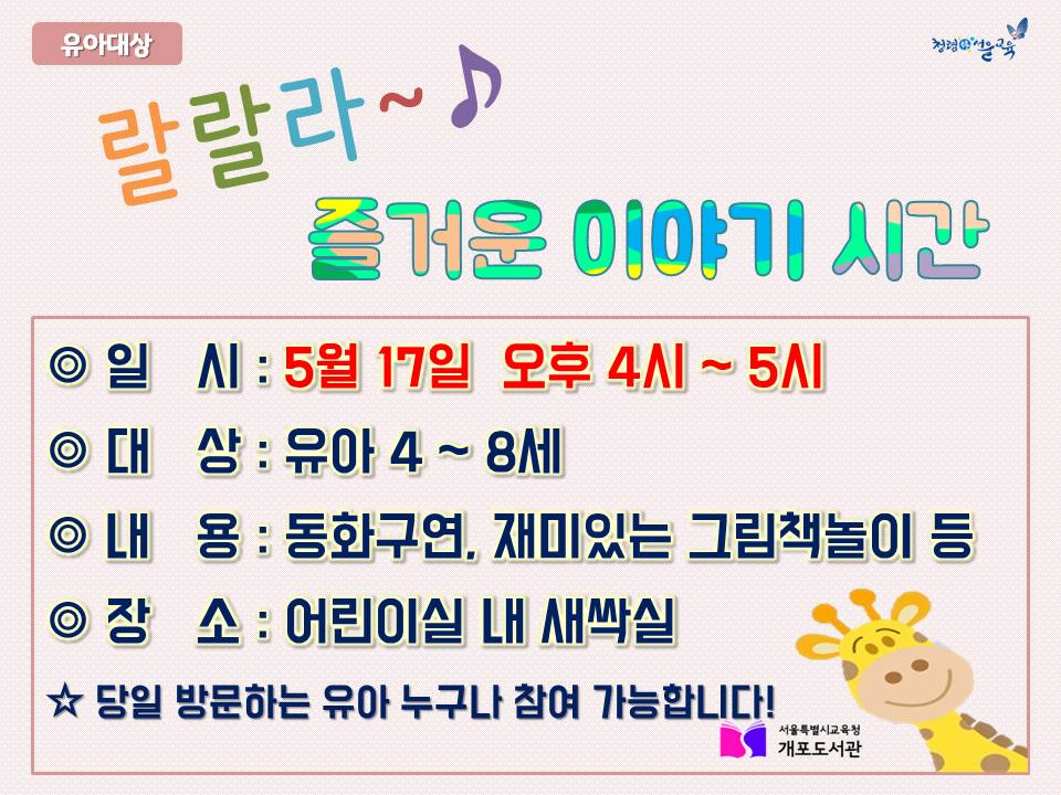 * 5월 17일 목요일 오후 4시에는 유아 4~8세를 대상으로 '랄랄라 즐거운 이야기 시간' 이 운영됩니다. 자원활동가 라경임 선생님의 동화구연과 재미있는 한글 책놀이가 있으며 원하는 유아 및 학부모 모두 당일 참여하실 수 있습니다.