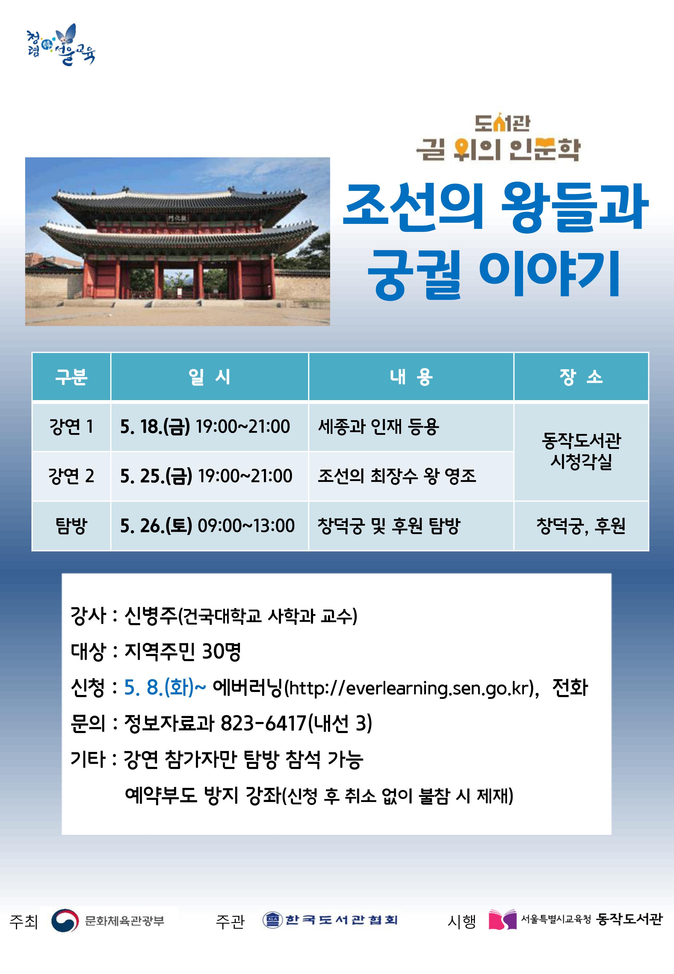 1차 주제 「조선의 왕들과 궁궐 이야기」 프로그램은 5월 18일부터 5월 26일까지 진행됩니다. 강사는 신병주 건국대학교 사학과 교수입니다. 신병주 교수는 역사의 대중화에 깊은 관심을 가져 KBS 《역사저널 그날》에 출연했고 여러 프로그램의 자문을 맡았으며, 저서로는 『신병주 교수의 조선 산책』, 『왕으로 산다는 것』등 다수가 있습니다. 강의를 통해 △세종과 △영조를 중심으로 조선의 역사를 살펴보고, 5월 26일에는 창덕궁 및 후원을 탐방할 예정입니다. (문의: 정보자료과 02-823-6417, 내선 3)