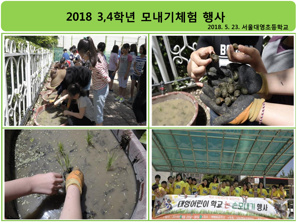 서울대영초등학교에서는 5월 23일(수) 학교 친환경농업 실천사업 모내기 체험행사를 실시하였습니다. 작년에 이어 진행된 본교 모내기 체험은 도시에 사는 학생들이 벼를 길러 봄으로써 우리 농산물의 소중함과 벼 한포기와 같은 작은 생명도 존중하는 마음을 기를 수 있도록 하기 위해 꾸준히 실시하고 있는 행사입니다. 올해도 낙농영농조합(전라북도)에서 3,4학년이 체험할 수 있는 충분한 수량의 모를 준비하여 아이들에게 모내기 시연을 해주셨습니다. 3,4학년을 대상으로 학생들은 모를 한 포기씩 건네받고 모가 꺾이지 않게 잡는 방법, 흙에 적당한 깊이로 심는 방법 등의 설명을 들었습니다. 작년에는 조심스레 모를 심었던 학생들도 올해는 너도나도 “한 포기 더 심을래요”“모내기 잘 할 수 있어요”라고 외치며 꼬마농부의 자신감을 보여주기도 했습니다. 쑥쑥 자라는 벼 줄기처럼 대영학생들의 바르고 맑은 인성도 쑥쑥 자라날 것입니다.