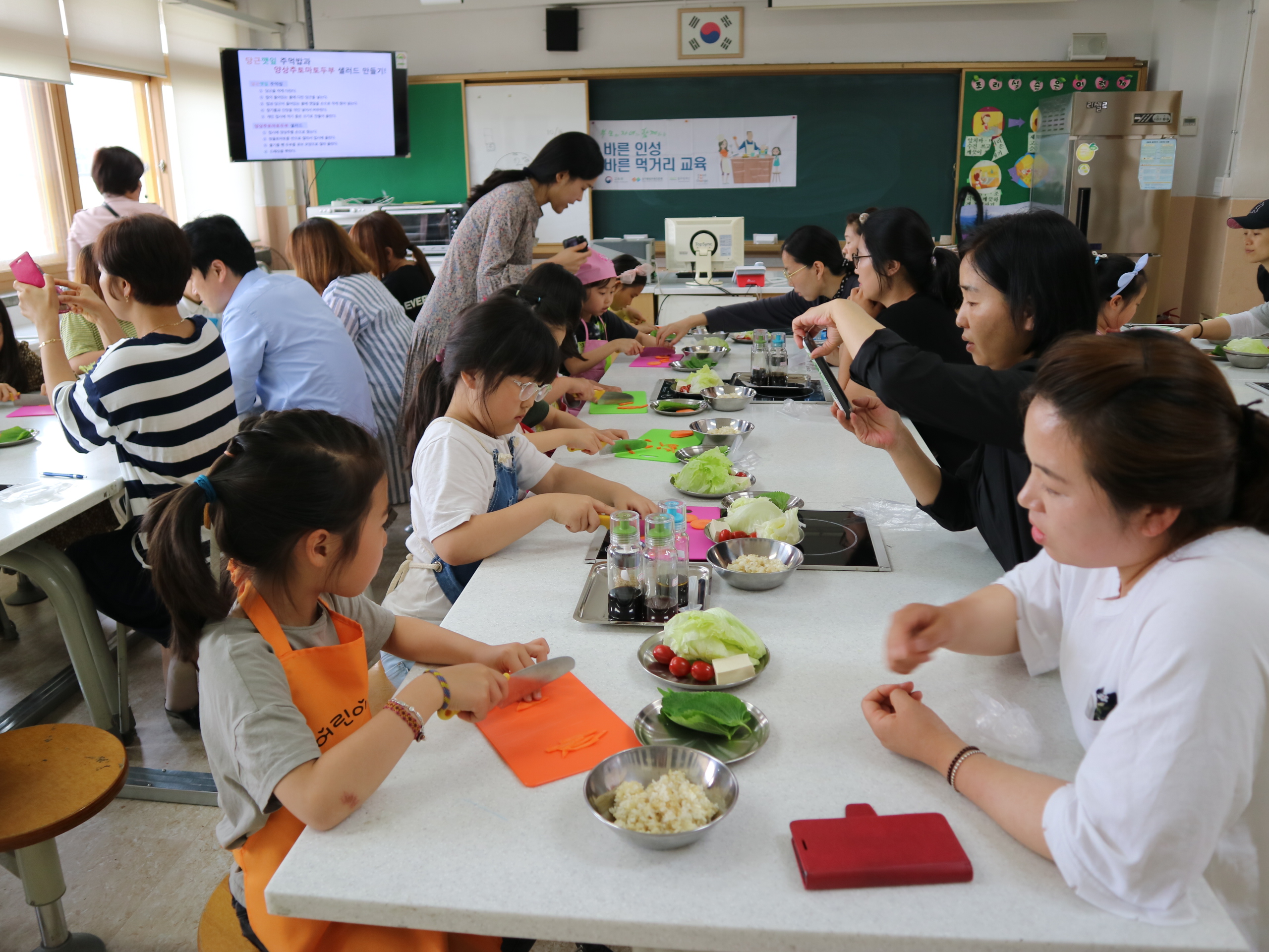 서울중랑초등학교(교장 서정미)는 지난 5월 15일(화) 2~4학년 학생-학부모 15가족을 대상으로 바른 먹거리 학부모 아이 밥상머리 체험교육을 실시하였습니다. 밥상에서의 교육은 가족이 함께 식사하면서 대화를 통해 가족 사랑과 인성을 키우는 시간입니다. 학부모와 아이가 바른 먹거리를 주제로 대화하고 함께 요리를 만들어 함께 먹는 동안 자연스럽게 기본적인 예절교육, 인성 교육, 사회성 교육도 이루어집니다. 2012년부터 진행되고 있는 ‘바른 먹거리 캠페인, 학부모-아이 밥상머리 체험교육’은 온 가족이 함께 요리하고 대화하면서 밥상에서의 교육을 즐겁고 자연스럽게 실천해 가는 생활 속 교육 프로그램으로, 이번 체험활동을 통해 학생과 학부모는 ‘양상추 토마토 두부 샐러드 & 당근 깻잎 주먹밥’을 함께 요리하며 칭찬, 지지와 스킨십을 나누고, 직접 요리한 음식을 함께 먹으며 칭찬, 지지, 맛에 대한 느낌 나누기 등의 대화를 나눌 수 있었습니다. 이번 체험교육을 통해 식사 규칙과 예절, 올바른 대화법을 충분히 실습할 수 있었습니다.