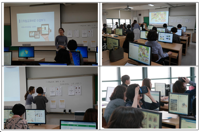 서울누원초 교사 신은지 강사가 디지털교과서 회원가입 및 활용 방법과 학습커뮤니티 위두랑을 활용하여 참여, 체험, 협력, 소통하는 학생 중심의 수업에 대한 강의를 진행하였습니다. 연수에 참여한 교사들이 직접 디지털 교과서를 활용해 보고, 학습의 실재성을 높이는 실감형 콘텐츠를 접목한 수업에 참여해 보았습니다.