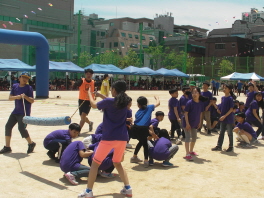 윤미희 교장선생님의 개회사를 시작으로 신나는 운동회를 시작하였습니다. 학년별로 하늘 높이 슛, 타이어 줄다리기, 애드벌룬 굴리기, 협력 공 튀기기, 인간 파도타기, 에어봉 릴레이를 청팀과 백팀간 나뉘어 진행하며 같은 팀간의 결속력과 단결력을 기를 수 있었습니다.