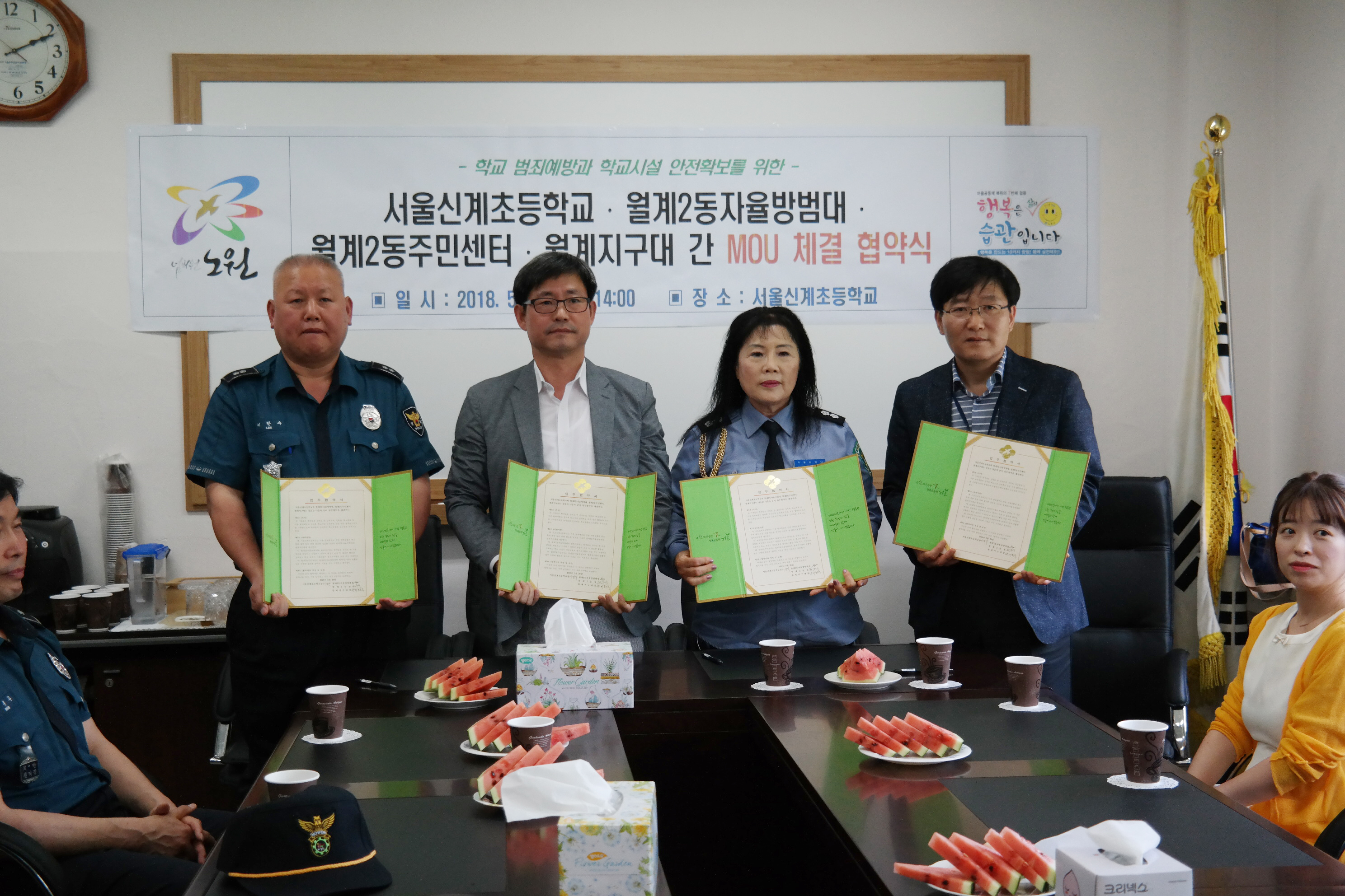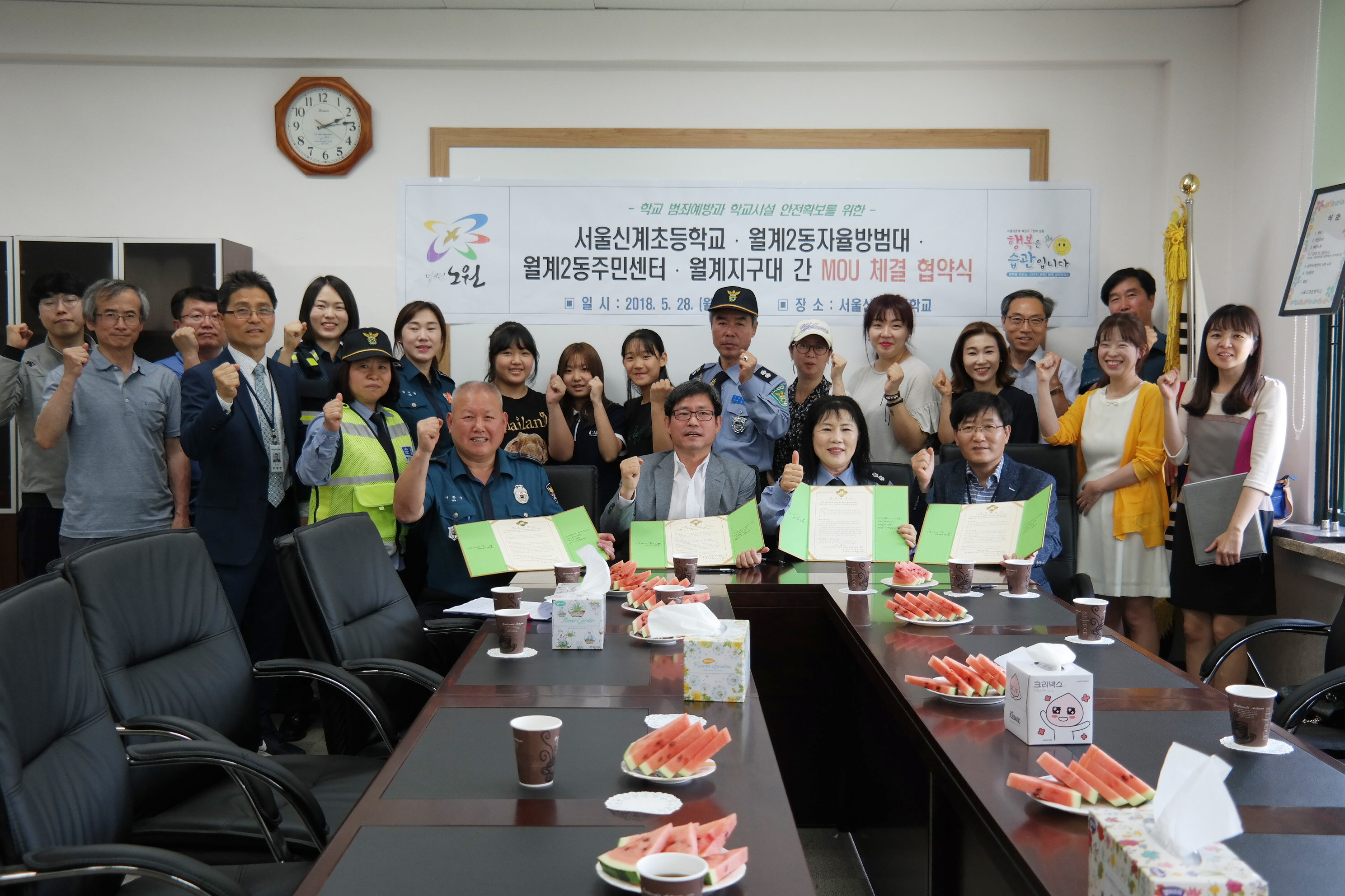 - 서울신계초등학교, 월계2동자율방범대, 월계2동주민센터, 월계지구대 MOU 협약식 체결 하고 앞으로 함께 지켜 나갈 것을 다짐하고 있다.