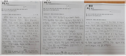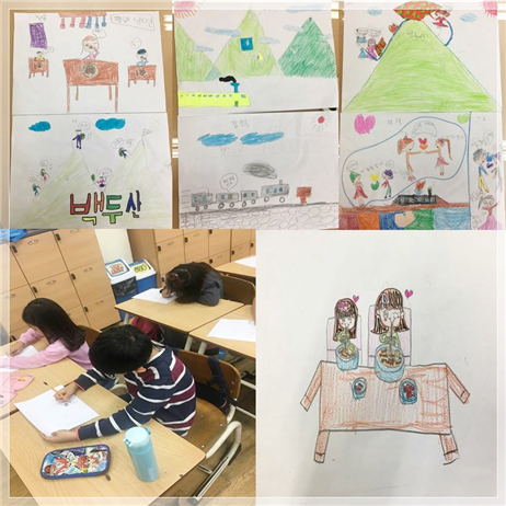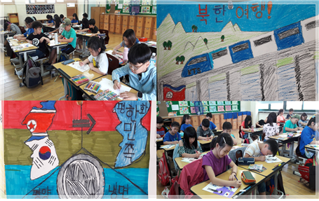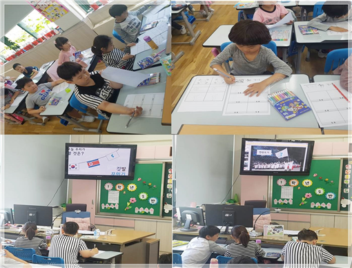 서울용두초등학교(교장 이정옥)는 5월 23일(수)~5월 25일(금)을 통일 교육 주간으로 지정하여 각 학년별 통일교육을 실시하였습니다. 학생들의 눈높이에 맞게 1학년 학생들은‘태극기’와 ‘인공기’ 및 ‘한반도기’를 배우고 통일에 대한 마음을 담은 ‘통일 깃발 꾸미기 행사’에 참여하였습니다. 만들기 활동 이후 이산가족의 슬픔에 대한 내용을 다룬 ‘가자미의 눈물’을 보며 통일에 대한 간절한 마음을 다질 수 있었습니다. 2학년 학생들의 통일교육으로는 통일 교육 관련 동영상인 ‘피노키오의 통일섬 대모험’영상 시청을 시작으로 통일이 되면 좋은 점에 대해 알아보고, 이산가족에 대한 설명을 들었습니다. 통일이 되면 기차를 타고 유럽까지 갈수 있다는 영상의 내용을 보며, 아이들의 눈이 반짝반짝하였고, 남한의 기술과 북한의 자원을 합치면 훨씬 더 강대국이 될 수 있다는 사실을 알고 어린이들은 빨리 통일이 되었으면 좋겠다고 말하기도 하였습니다. 동영상 시청 후 어서 빨리 통일이 되기를 바라는 마음으로‘통일이 되면 하고 싶은 일을 그리기 활동’을 하였습니다. 백두산, 금강산으로 체험학습을 가고 싶다는 아동, 평양에 가서 평양냉면을 먹어보고 싶다는 아동 등 통일을 기원하는 여러 결과물이 나왔습니다. 이어서 3학년 학생들은 ‘통일된 우리나라에서 하고 싶은 일 상상하여 나타내기’, 5학년 학생들은 분단으로 인해 달라진 남한과 북한의 말을 알아보고, 아나운서가 되어‘통일뉴스를 발표해 보기’ 등 학년 수준에 맞는 적절한 통일교육이 이루어졌습니다. 이번에 실시한 통일교육을 계기로 용두초등학교 학생들이 통일에 대하여 지속적으로 생각해 볼 수 있는 의미 있는 시간을 갖게 되길 바랍니다.
