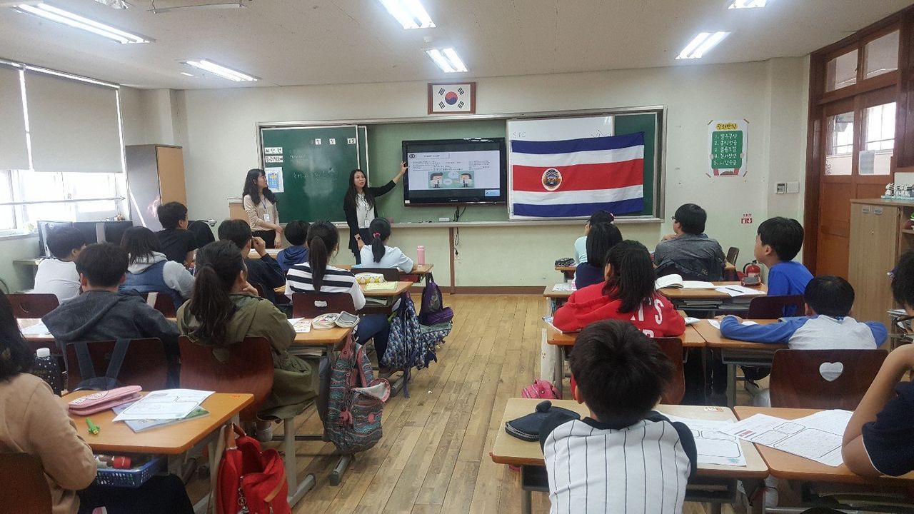 5월 9일(수) 2,3교시에 6학년 2반을 대상으로 코스타리카 출신 Andrea Leon lrola 강사님의 유네스코 CCAP (Cross Cultural Awareness Programme)가 진행되었습니다. 학생들은 이 시간을 통해 중미의 유럽이라 불리는 코스타리카의 위치, 국기, 언어, 기후 등에 대해 배웠습니다. 코스타리카는 인구가 5백만도 채 안되지만 원시림이 풍부하여 전세계 생물종의 5%가 살 정도로 생물자원이 많은 나라라고 합니다. 학생들은 강사님이 준비해온 코스타리카 화폐와 기념품을 보고, 전통 의상도 직접 입어보며 다소 생소한 나라였던 코스타리카에 대하여 더욱 친근하게 느끼게 되었다고 합니다.