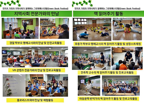 초록이 아름다운 가정의 달 5월, 푸르른 계절만큼 신선한 독서활동이 연지초등학교(교장 이향아)에서 이어지고 있습니다. 그린북페스티벌(Green Book Festival)은 1학기 5월 셋째주 동안 학부모를 비롯한 다양한 지역사회 전문가들의 재능기부로 진행되었습니다. 재능 기부자들은 자신의 전공분야와 관련된 도서를 학생들의 눈높이로 읽어주고, 학생들은 이를 통해 직업의 세계를 체험할 수 있는 뜻깊은 시간이었습니다.