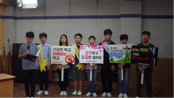 2018년 5월 31일 세계금연의 날을 기념하여 우리 석촌초등학교에서는 28일(월요일) 방송조회시간에 금연선포식을 실시하였습니다. 학생회장의 힘찬 선서와 함께 전교생이 평생 담배를 피우지 않겠다는 서약을 하였습니다. 담배모형을 가위로 자르는 금연 퍼포먼스를 보며 함께 환호하고 교장선생님의 쉽고 귀에 쏙쏙 들어오는 흡연예방 훈화말씀은 즐겁고도 유익했습니다. 다시 한 번, 담배의 유해성을 마음에 새기며 평생금연의 의지를 더욱 굳건히 다져봅니다. 아직 담배를 끊지 못한 학부모님이 계시다면 이번 기회에 금연에 도전해 보시면 어떨까요? 가족을 위한 최고의 선물이 될 것입니다.