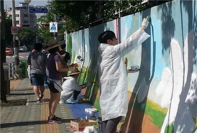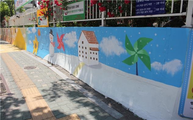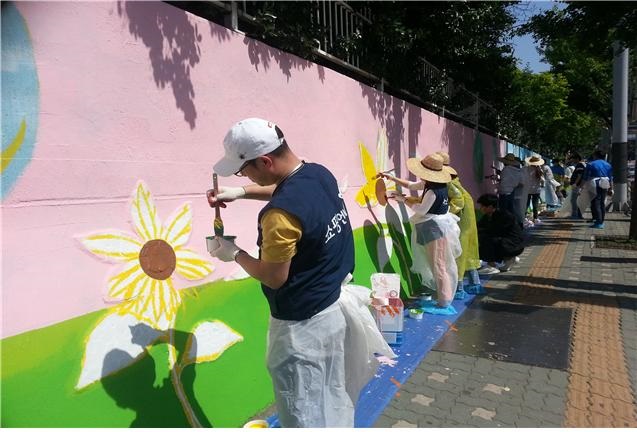 담장 벽화그리기에는 후원 회사의 자원봉사자 40여명이 참여해 학교 정문 주변 담장을 꾸미는 아름다운 등굣길 만들기 활동을 진행하였습니다. 약 70여미터 길이의 담장 벽화는 봄, 여름, 가을, 겨울 사계절을 테마로 하여 완성되었으며, 어린이들이 좋아하는 귀엽고 예쁜 동물, 꽃, 바람개비 등으로 꾸며졌는데, 학교 울타리의 푸르른 사철나무, 장미 등과 어울려 분위기를 환하게 바꿔주었습니다. 정문 교체와 담장 벽화그리기 완성으로 서울금양초등학교 학생들과 학부모 뿐 아니라 지역 주민들도 아름다운 마을, 깨끗한 학교가 되었다고 기뻐하며 자랑스러워하고 있습니다.