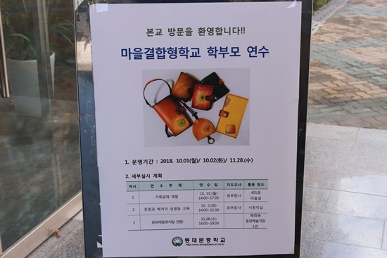 본교는 2018학년도 서울형 메이커 모델학교로 학생 교육뿐만 아니라 학부모들도 메이커로서 삶의 역량을 높이고 이해를 돕기 위하여 10월 1일에는 가죽공예를 체험하는 시간을 가졌고, 10월 2일에는 존중과 배려의 성평등 교육을 기획하여 청소년기 자녀의 성평등 교육의 어려움을 겪는 학부모들에게 현실적인 도움을 주고자 질문과 답변 형식의 워크숍을 진행하였다.