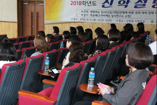 서울특별시 강서양천교육지원청 관내 신정여자중학교(교장 박흥규)는 전교생과 학부모 가운데 신청자를 받아 고입과 대입 진학 안내 강연을 진행하였다.