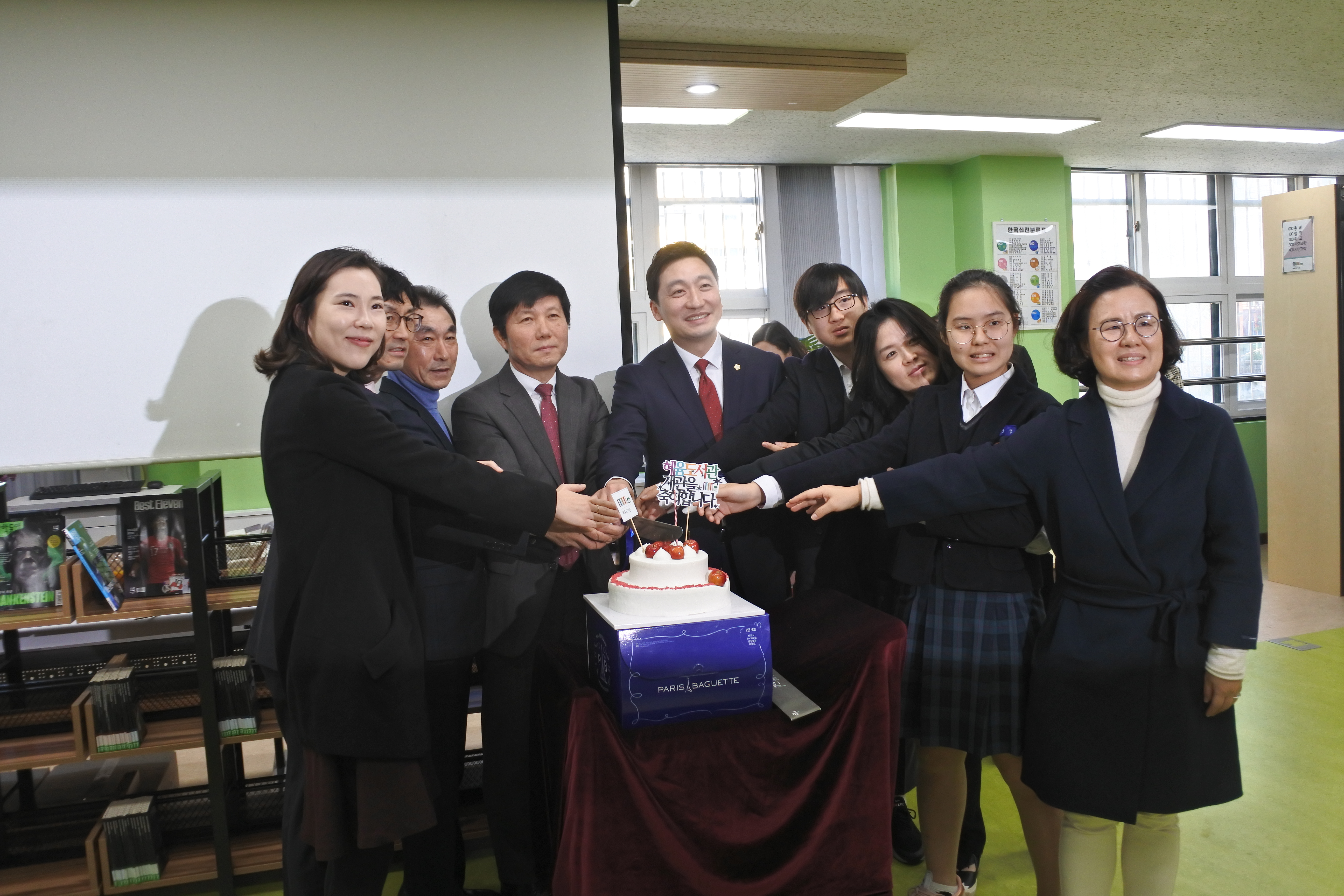 이에 2017년 5월 본교에서 진행한 ‘구청장과 함께하는 스쿨톡’(조은희 서초구청장, 김선자 교장)에서 학부모 독서동아리 회장님을 주축으로 하여 도서관 이전에 대한 지원을 요청하게 되었다. 드디어 12월에 지역의 도움으로 도서관 이전 비용을 확보하였으며, 학교에서는 교육청의 ‘학교도서관 문화시설(청소년 문화카페) 설치 사업’을 신청하여 1000만원의 예산을 보태게 되었다.