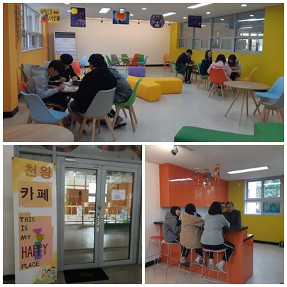 천왕중학교(교장 송형세)는 본관 2층 베란다를 리모델링하여 학생과 교직원을 위한 ‘천왕카페’로 만들었다. 쉬는 시간, 점심시간과 방과 후에 휴게장소로 사용되며, 각 교과별로 수업 중 결과물을 벽이나 공간에 전시하거나 게시하여 전시장의 역할도 하게 된다. 따뜻한 음료를 마실 수 있도록 전기 포트, 인덕션, 머그컵 등도 준비되어있다.