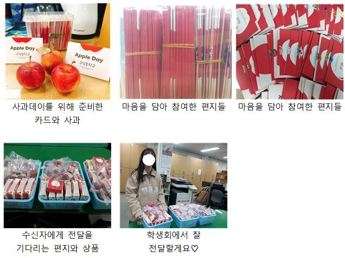 구일중학교(교장 장은진)는 2학기 인성주간 10월 24일(수)~26일(금)에 사과의 날 행사를 가졌다. 학생회에서는 미리 구일중학교 이름이 들어간 카드를 준비하였다. 희망 학생들이 수~목요일에 준비된 카드를 이용하여 친구, 선생님, 또는 자기 자신에게 ‘사랑해, 미안해’ 편지를 써서 가져왔다. 금요일에는 학생회에서 상대방에게 편지와 함께 선물을 전달하였다. 학생들은 오랜만에 아날로그 방식으로 마음을 전달하는 시간을 가졌다.
