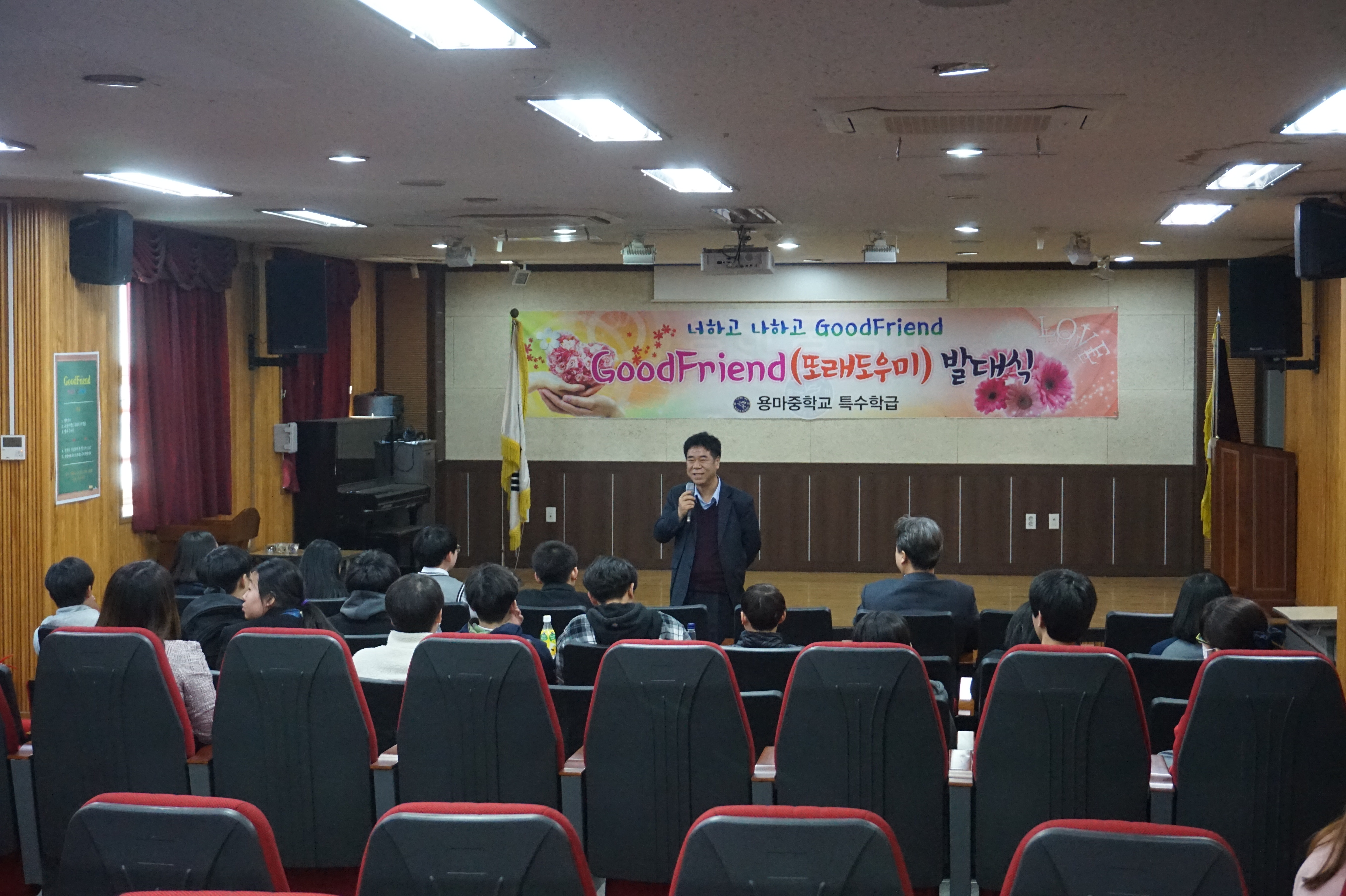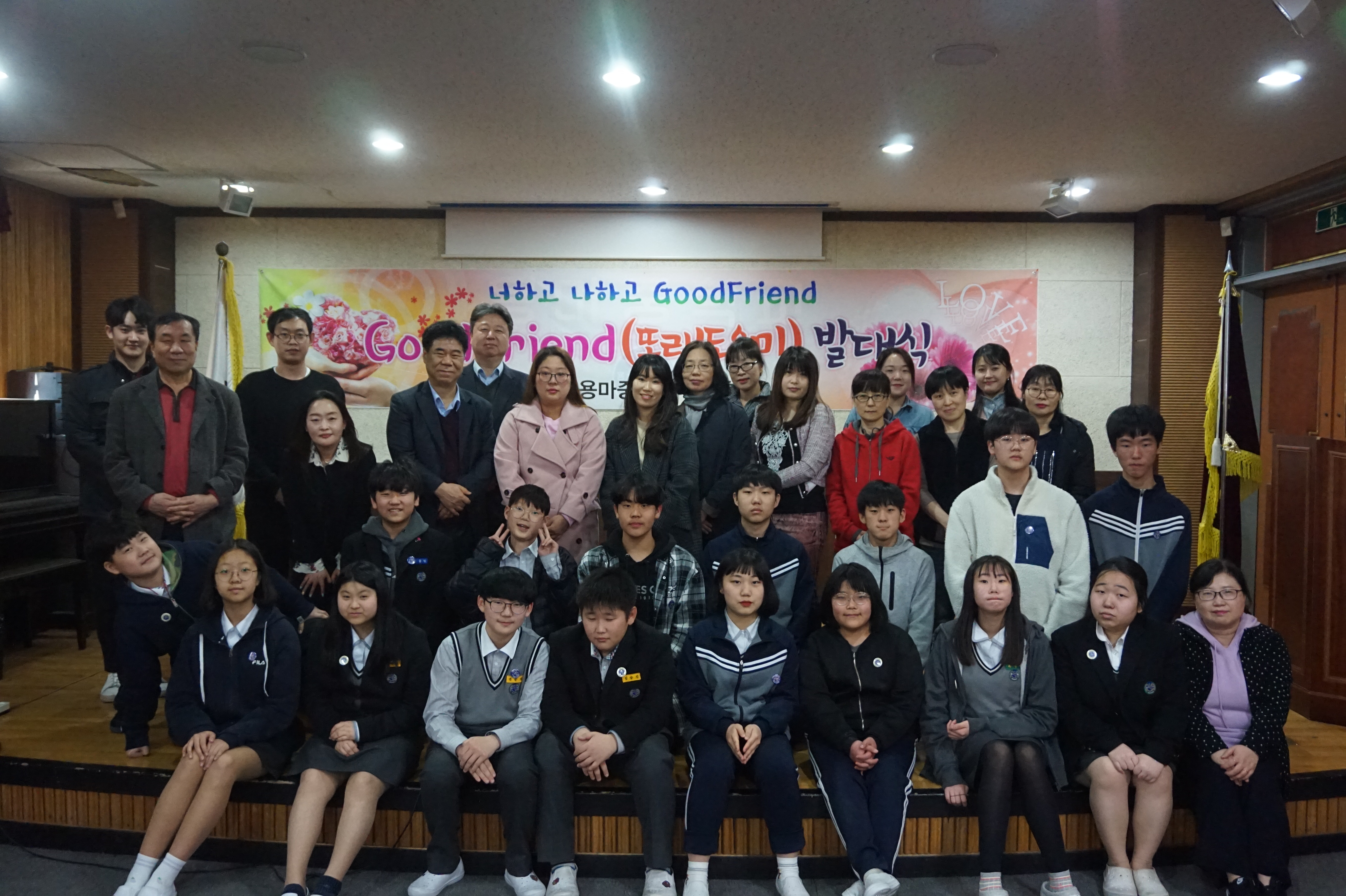 용마중학교(교장 류민석)는 2019년 3월 29일(금)에 Good Friend(또래도우미) 발대식을 개최하였다. 류민석교장 외 최연석교감, 김종철상담부장, 특수학급담임, 통합학급담임, 특수교육지원인력, 학부모님, 장애학생, 또래도우미 등 총 40여명이 모여 포근한 봄날처럼 따뜻한 마음을 나누는 시간을 가졌다.