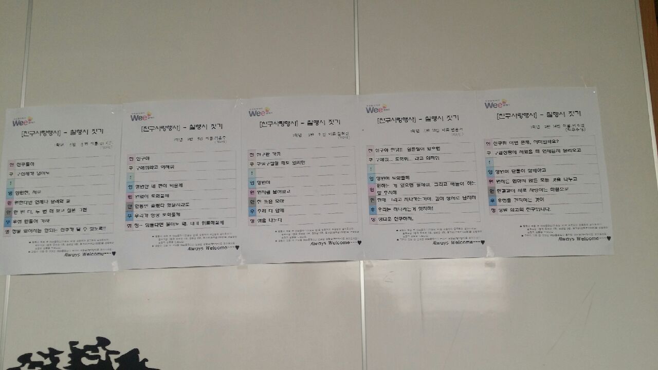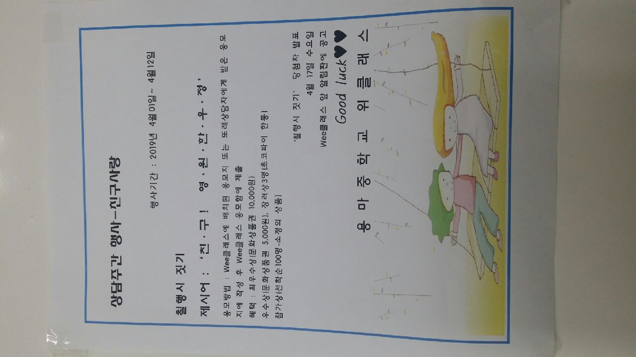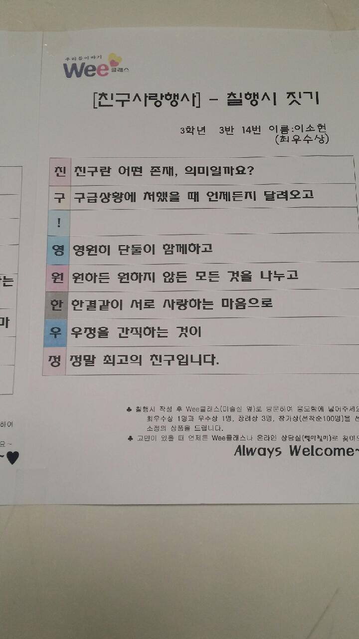 상담주간 행사로 ‘친·구! 영·원·한·우·정’라는 제목의 칠행시를 지어 제출한 작품 중에 최우수상 1명과 우수상 1명, 장려상 3명을 선정하였고, 참가상은 선착순으로 조그마한 마음의 선물을 제공하였다.