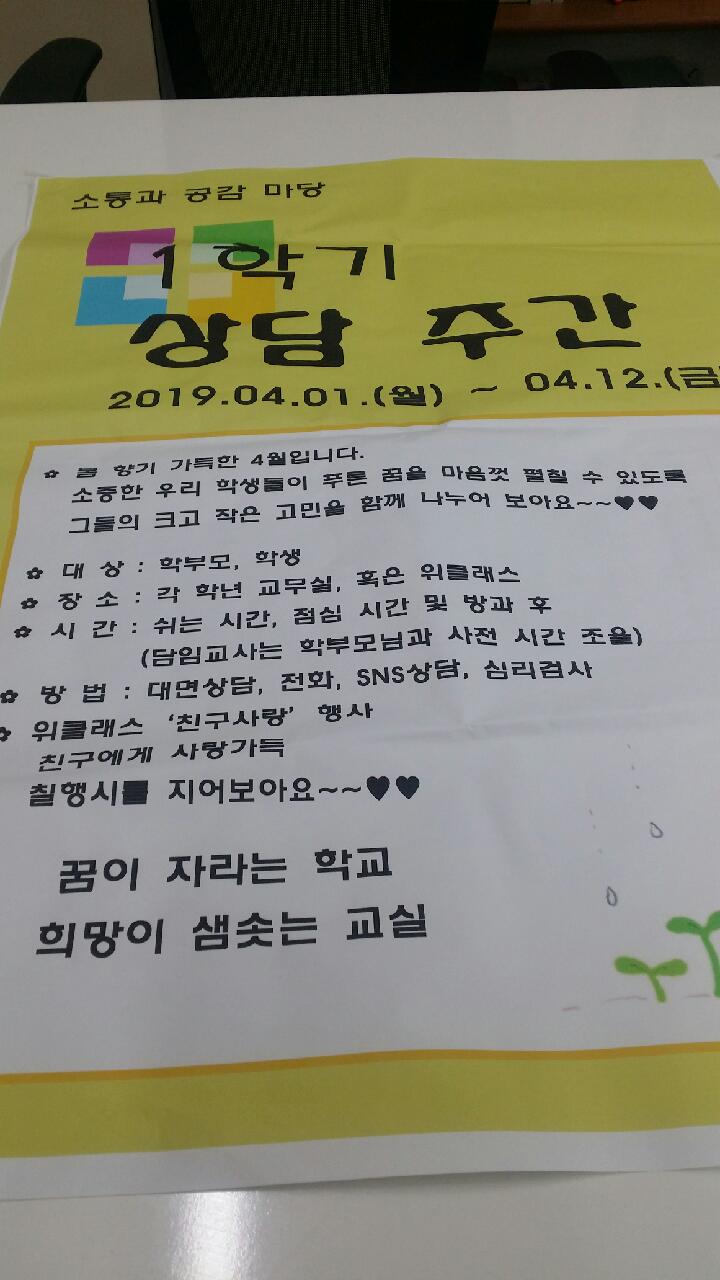 용마중학교(교장 류민석)는 봄 향기가 시작되는 4월, 소중한 학생들이 즐겁고 행복한 청소년기를 보내기를 바라는 마음으로 또 그들의 작은 고민도 함께 나누고자 2019년 1학기 상담주간을 실시하였다. 4월 1일부터 4월 12일까지 학생과 학부모님을 대상으로 학교생활, 교우관계, 학업, 진로 등 궁금한 점을 심도 있게 상담하는 시간이었다.