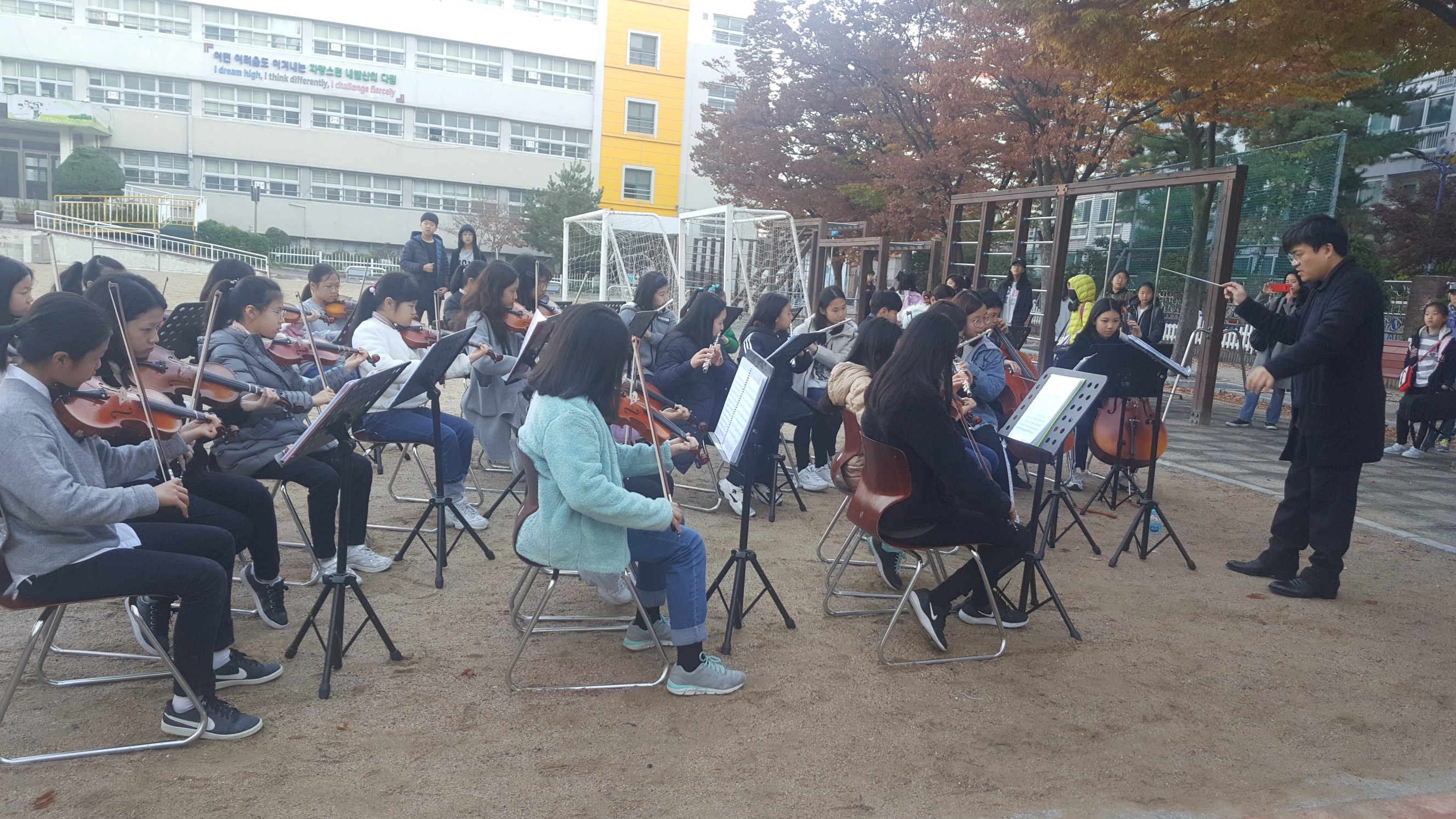 서울내발산초등학교(교장 오미향)에서는 11월 12일(화) 아침에 가을 단풍처럼 아름다운 음악 소리가 교정에 울려 퍼졌습니다. 아름다운 음악 소리의 주인공은 다름 아닌 내발산초등학교 자랑인 샛별 오케스트라였습니다. 강요한 지휘자 선생님 지휘 아래 32명의 샛별 오케스트라 단원들은 모차르트의 아이네 클라리넷 나이트 뮤직, 알라딘 OST, 라데츠키 행진곡 외 4곡을 연주하였습니다. 32명의 샛별 오케스트라 단원들은 이른 아침 다소 쌀쌀한 날씨에 손이 차가워 악기 연주에 어려움이 있었을텐데도 아랑곳하지 않고 멋진 선율과 하모니를 친구들, 선생님, 학부모님께 들려 주어 잔잔한 감동을 선물하였습니다. 바쁜 시간에도 매주 수요일 2시간씩 꾸준히 연습을 한 오케스트라 단원들의 노력을 엿볼 수 있었습니다. 친구들, 선생님, 학부모님께 멋진 음악을 선물해 준 강요한 지휘자 선생님과 샛별 오케스트라 32명의 단원들에게 큰 박수를 보내며 앞으로 더욱 멋진 연주 기대합니다.