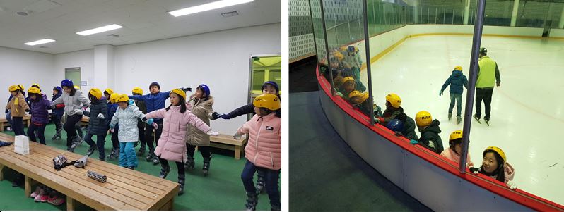 먼저 스케이트 신발 착용 방법을 배우고 착용한 다음 준비운동을 하였습니다. 실내가 춥기 때문에 더욱 열심히 준비운동을 하면서 근육을 충분히 풀어주었습니다. 아이스링크장 밖에서 기본 동작을 연습한 다음 넘어지지 않게 조심하면서 아이스링크장 안으로 들어갔습니다.