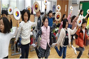원명초등학교 2학년 어린이들은 서초구에서 지원하는 1인 1악기 수업으로 소고놀이를 배웠습니다. 1학기 때 수업지원을 받았고 이것을 바탕으로 수업시간에 소고를 치며 소고춤도 추어 보았습니다.