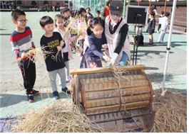 서울옥정초(교장 이근실) 4학년 학생들이 주최로 10월 30일(수) ‘도심 속 학교 논 가을 추수’행사를 개최했습니다. 봄에 심었던 벼에서 나락이 떨어지며 누렇게 익는 모습을 그동안 지켜보다가 오늘은 벼를 베어서 벼를 훑고 방아도 찧고 키질도 하며 벼에서 쌀이 만들어지는 과정을 보았습니다. 또한 돌아가면서 떡메도 쳐서 본인들이 친 떡메로 인절미에 콩고물에 묻혀서 먹고 뻥튀기기계에서 “뻥이요” 하며 터지는 밥풀도 나누어 먹는 시간을 보냈습니다. 더불어 민속놀이도 함께 했는데 볏 짚단으로 중심을 잡아서 만든 널뛰기와 학부모님들이 돌려주는 긴 줄넘기, 투호던지기 고리 던지기, 비사치기, 제기차기 등 다양한 민속놀이를 체험하는 시간을 보냈습니다. 올해는 1,2,4학년만 참여하였고 내년에도 4학년에 주최가 돼서 벼 심기부터 할 예정입니다. 이런 행사를 함으로써 우리가 매일 먹는 쌀이 어떤 과정을 겪으며 생산되어서 밥상까지 오는지 알게 되었으며 쌀로는 밥 외에도 떡이나 뻥튀기 같은 먹거리도 만들어 먹을 수 있다는 것을 배우는 계기가 되었을 것으로 생각됩니다. 참여하는 모든 학생들이 즐거워하며 모두가 신나고 뜻깊은 시간을 갖은 것 같아 다행스러웠습니다.