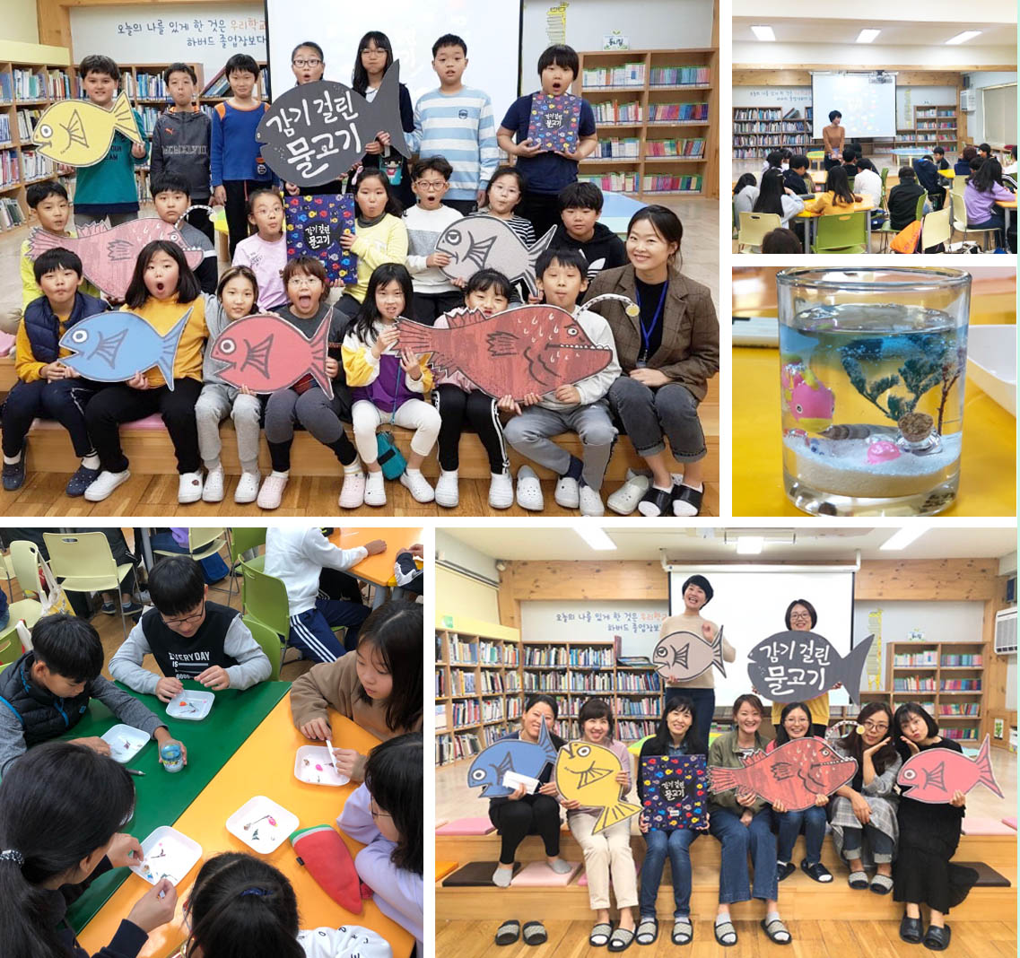 올해의 선정도서는 박정섭 작가의 그림책 ‘감기 걸린 물고기’ 였습니다. 이 책은 근거 없는 소문에 휩싸여 서로를 의심하고 오해한 물고기들을 통해 우리의 모습을 되돌아보게 합니다. 그림책엄마들의 재미난 구연으로 다 함께 재미나게 책을 읽고 난 뒤 ‘소문이 사라지는 바다 만들기’를 활동을 했습니다.