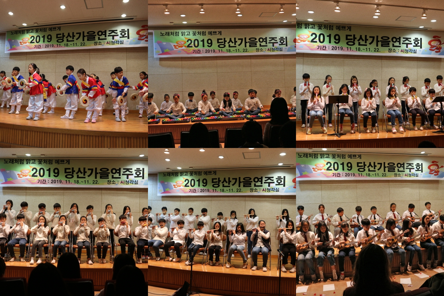 서울당산초등학교(교장 안광용)에서는 11월 18일(월)~22일(금)까지 당산 가을연주회를 실시하였습니다. 1~6학년 전교생이 참여하여 1인 6악기 수업시간에 배운 학년별 악기로 그동안 갈고 닦은 실력을 뽐내고 끼를 발산할 수 있는 다양한 프로그램(연극, 율동, 전통음악 등)을 준비하여 가을연주회에 참석하신 학부모님과 함께 즐거운 시간을 가졌습니다. 열심히 악기를 배우고 멋진 공연을 한 학생들에게 칭찬의 박수를, 여러 가지 악기를 지도해주신 여러 선생님들, 항상 응원해주시고 격려해주신 학부모님들께 감사의 인사를 전합니다.
