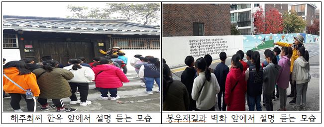 학교에서 출발하여 경동제일교회에 도착하여 100년 이상 된 교회의 유래와, 학교가 없었던 동네 아이들을 위해 박용환님이 건립한 동창학교 등에 대하여 설명을 들었다. 그 다음 봉우재길과 벽화를 살펴보며 지명의 유래에 대해서 설명을 들었다. 마지막으로 해주최씨 한옥과 성덕사에 도착하여 양옥과 한옥의 차이에 대한 설명을 듣고, 성덕사가 건립된 유래를 들으며 탐방을 마무리 하였다.
