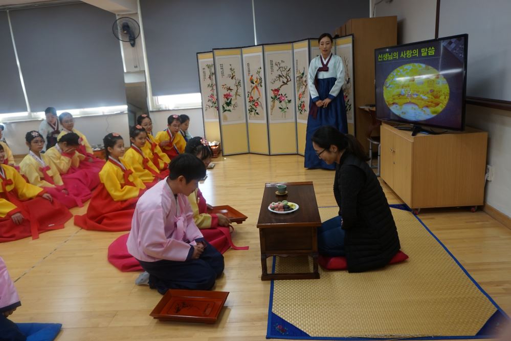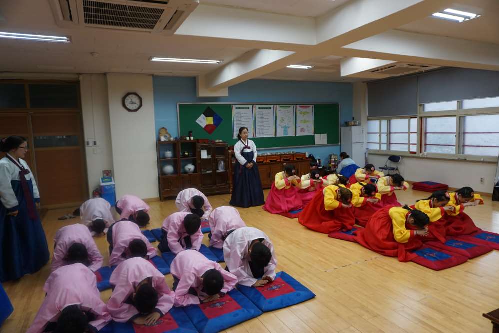 5학년은 다식을 만들고 다도를 익혔으며 6학년은 진정한 예절의 의미를 알아보고 우리 옷 입기 및 절하기, 책례를 익혔습니다. 오늘날 생활 속에서 잊혀지고 흔히 접하기 어려운 전통 예절을 실습을 통하여 익히며 그에 담긴 의미를 되새기고 우리 조상들이 사람들과 함께 어울려 지내는 과정에서 예의를 얼마나 중요하게 여겼는지와 예의를 지키는 것이 배려의 기본임을 알게 되었을 것입니다. 또한 그러한 예의가 현대를 살아가는 우리들에게도 필요함을 느끼게 해주는 귀한 시간이 되었을 것으로 생각됩니다.