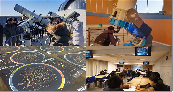 6학년 학생들은 천문대에서 태양관측, 천체투영관, 별자리 성도 수업, 우주퀴즈를 프로그램을 체험했습니다. 날씨가 좋아 태양을 뚜렷하게 볼 수 있었습니다. 올해는 태양활동이 가장 적은 태양 극소기라 흑점은 관측할 수 없었지만 태양 표면의 홍염은 관찰할 수 있었습니다. 야광 풀로 성도에 있는 별들을 찍어보며 별자리를 익혔습니다. 천체투영관에서는 돔형 스크린에 펼쳐진 우주비행사에 관한 영상, 별자리와 은하에 대한 영상을 보며 우주에 대한 꿈을 더 자세히 그릴 수 있었습니다. 야광풀로 성도에 별을 그리며 우리나라에서 관찰할 수 있는 별자리를 알아보고 골든벨 형식의 우주퀴즈를 통해 우주에 대한 지식과 상식을 자연스럽게 습득할 수 있었습니다.
