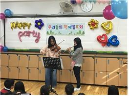 학부모님들 앞에서 시낭송, 독창, 합창, 리코더 연주, 합창, 첼로와 바이올린 연주, 패러디,