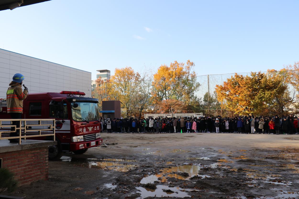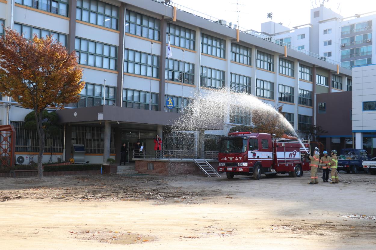 이번 훈련에서 우리 학교와 방배 119 안전센터 합동으로 화재대피 소방훈련을 실시했다. 먼저 각 교실에서 화재 시 행동요령에 대한 동영상을 시청한 후 본교 3층 과학실에서 원인불명의 화재가 발생하였다고 가정하여 훈련을 실시했다. 각 학급 담임 선생님들께서 신속하게 인솔하여 대피가 잘 이루어졌고 교과전담교사 및 교직원께서 대피 유도를 잘 해주셔서 전교생이 운동장으로 대피할 수 있었다. 방배 119 안전센터에서 나온 소방차에서 불이 난 쪽을 향해 소방수를 살수하여 화재 시 불 끄는 모습을 시범으로 보여주셨고, 소방관께서 화재 시 대피요령을 강평해주셨다.