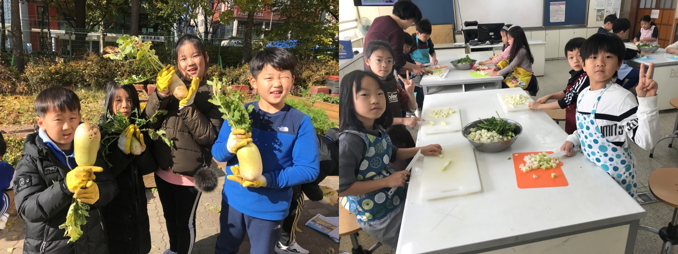 서울당산초등학교(교장 안광용) 2학년 학생들은 11월 21일(목) ~ 22일(금) 이틀에 걸쳐 깍두기 담그기 및 안전한 먹거리에 대한 수업이 실시되었습니다. 그동안 아이들이 텃밭에서 길러온 무를 직접 수확하여 재료를 준비하고, 실과실에서 직접 썰어보고 양념을 버무려 먹음직스러운 깍두기를 담갔습니다. 아울러 친환경 음식 재료 및 안전한 먹거리에 대해서도 배울 수 있었습니다. 직접 만든 깍두기를 점심 급식과 함께 먹어보고, 집에서도 가족들과 함께 나눌 수 있는 의미 있는 경험이었습니다.