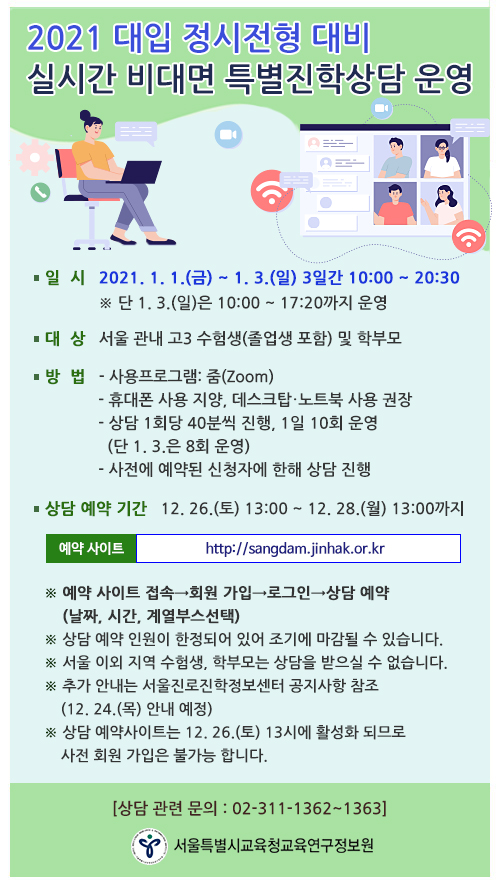 ▢ 서울특별시교육청(교육감 조희연) 산하 교육연구정보원(원장 임유원)은 2021년 1월 1일(금)부터 1월 3일(일)까지 서울 소재 고등학교 3학년 수험생(졸업생 포함) 및 학부모 약 1,200명을 대상으로 2021학년도 대입 정시전형 대비 특별진학상담센터를 운영한다. 상담 신청은 2020년 12월 26일(토) 13:00부터 28일(월) 13:00까지 온라인 예약 사이트에서 할 수 있다.