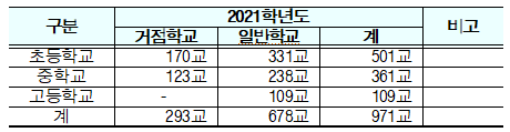▢ 교육복지우선지원사업 대상학교는 집중지원 학생수가 많아 전문인력과 운영예산을 지원받는 ‘교육복지우선 거점학교’(이하 ‘거점학교’)와 학생당 예산을 지원받고 지역교육복지센터와 연계하여 프로그램을 운영하는 ‘교육복지우선 일반학교’(이하 ‘일반학교’)로 나뉜다. 2021학년도 교육복지우선지원사업 대상학교는 거점학교 293교, 일반학교 678교로 총 971교이다.
