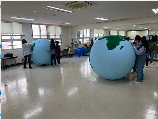 먼저 '그린볼로 지구 온도를 낮추자'는 급격한 기후변화에 따른 피해 상황을 알아보고 커다른 그린볼을 굴려 바닥에 떨어진 카드를 붙여오는 게임을 하였습니다. 'AR 미세먼지 대응교육'은 태블렛에 앱을 설치하여 미세먼지와 관련된 정보를 습득하고 줄일 수 있는 방법에는 무엇이 있는지 탐구하였습니다. 마직막으로 '지구를 위한 슬기로운 소비' 활동에서는 모둠별 보드게임을 통해 지구를 도와줄 수 있는 소비에는 어떤 것들이 있는지 즐겁게 배울 수 있었습니다.