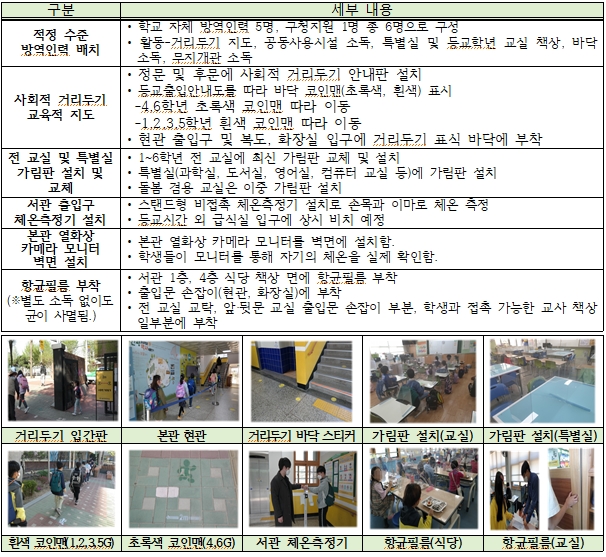 서울안평초등학교(교장 최재광)는 코로나19의 장기화 상황에서 학생과 교직원의 안전한 교육활동을 보장하고자 감염 위험 요소를 사전에 차단하고 방역을 강화하기 위해 여러 가지 대책을 강구하여 실천하고 있습니다. 사회적 거리두기 교육적 지도를 통해 학생들의 자발적 안전한 생활 실천을 이끌어내고 항균필름 부착, 전 교실 가림판 설치, 체온 측정기 추가 설치 등 학교 현장에서 빈틈없이 최선의 방역을 실시하고 있습니다. 학교 안의 철저한 방역 뿐만 아니라 나아가 학교와 가정, 지역사회 모두가 관심을 갖고 실천하기를 기대합니다.