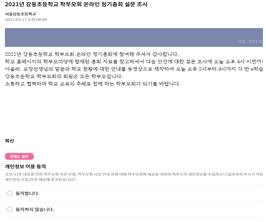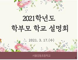 서울강동초등학교(교장 윤경동)에서는 2021년 3월 17일(수)에 온라인 학부모총회를 실시했다. 서울강동초등학교 학부모회는 서울특별시교육청 학부모회 연간 활동계획을 수립하여 학부모교육 및 연수, 동아리활동 등을 꾸준히 운영해 오고 있으며, 올해는 코로나19 확산 예방을 위하여 2021학년도 학부모 총회를 학교 홈페이지와 e학습터, e알리미 온라인 설문을 활용하여 개최하였다.