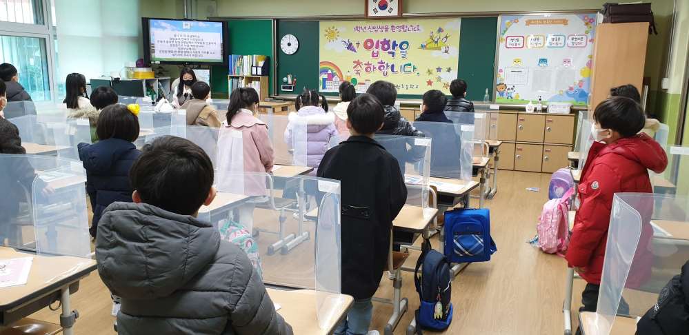 코로나 19 예방을 위해 발열체크 및 거리두기 등의 방역 수칙을 지키며 각 학급 교실에서 안전하게 입학식이 진행되었습니다. 1반부터 8반까지 배정된 1학년 학생들은 설레는 마음으로 선생님과 친구들을 만났고, 선생님으로부터 이름표를 건네받아 목에 걸었습니다. 이미란 교장선생님께서는 학교생활에 중요한 내용들을 당부하시며 신입생들의 입학을 축하하고 응원해 주셨습니다.