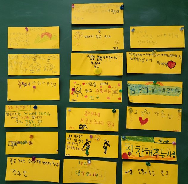 지난 3월 22일(월)~3월 26일(금)은 신학기 맞이 친구사랑생명존중 교육주간이었습니다. 자존감을 높이고 친구의 미덕을 찾는 다양한 활동을 학급별로 실시하였습니다.