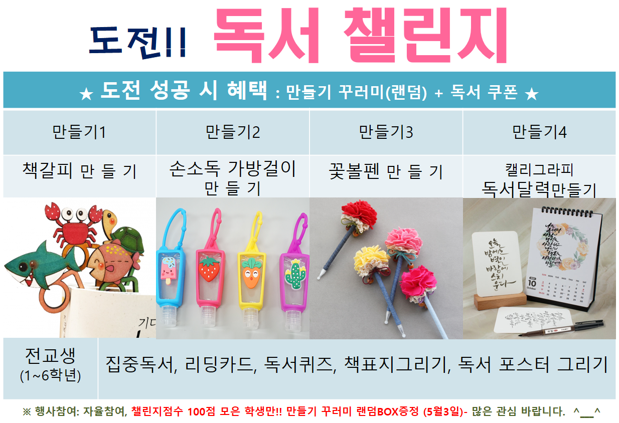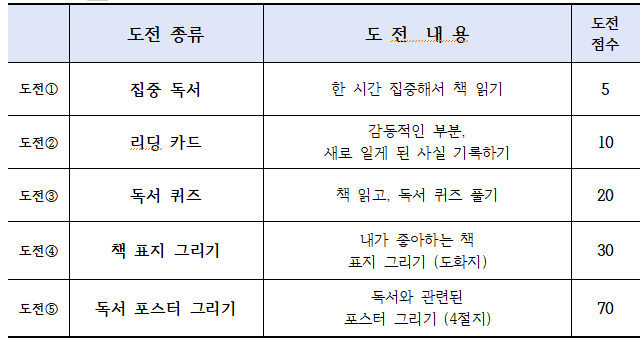 자신이 좋아하는 분야의 책을 읽고, 다양한 도전 주제에 맞게 미션을 수행하고, 성취하는 과정을 통해 어린이들은 독서의 즐거움을 느낄 수 있을 뿐만 아니라 도전 의식과 긍정적인 자아가 형성되는 계기가 될 것입니다.