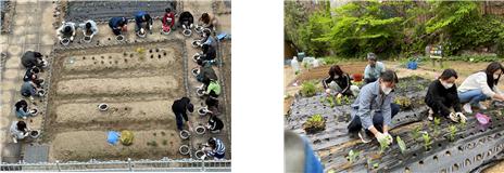 지난 4월 23일에는 송정초등학교 텃밭에 활력이 넘쳤습니다. 마지막 꽃샘추위가 지나길 기다렸다가 드디어 모종이 들어온 날이었습니다. 이미 곰취와 곤드레, 당귀, 마늘, 양파가 겨우내 숨어 있다가 먼저 올라와 기지개를 켜고 뻗어가고 있었지만 많은 이랑이 주인을 기다리고 있었습니다. 작년에는 학생들이 온라인 학습만 하던 기간이라 선생님들만 참여하셨는데 올해는 직접 텃밭에 나와 모종을 심어보고 싶어 하는 반의 신청을 받아 행사를 진행했습니다. 도시농부 선생님과 담임선생님의 도움을 받으며 시차를 두고 안전하게 모종을 심었습니다. 점심시간에 친구들과 같이 먹을 쌈채소, 동글동글한 모양이 예쁜 방울토마토를 심었고 교육과정과 연계해서 5학년은 상추 모종을 심기도 했습니다. 학생들이 미처 심지 못한 모종들은 생태환경교원학습공동체 선생님들께서 시간을 내서 도와주셨습니다. 올해 처음 심어보는 수박, 땅 속에서 영글어갈 땅콩과 고구마, 키가 쑥쑥 자랄 가지와 고추, 넝쿨을 타고 올라갈 오이와 수세미, 다람쥐의 먹이가 될 해바라기와 2학년 동생들이 관찰할 봉선화, 천일홍 등 40여 가지의 작물들을 심었습니다. ‘송정초록농원’으로 들어가는 입구 터널에는 조롱박을 심고, 4층 까지 올라갈 작두콩도 심었습니다. 올해는 더 다양한 작물을 심고 수확해서 체험활동의 기회를 넓혀갈 예정입니다. 5월 첫 주에는 생태체험부 동아리 학생들이 나머지 빈 공간을 채워 생태전환교육의 내실화를 이루어갈 계획입니다.