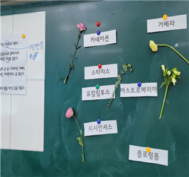 꽃바구니 만들기 활동을 통해 학생들은 생화를 만지고 향을 맡으면서 자연의 아름다움과 심리적 안정감을 느낄 수 있었습니다. 그리고 작은 꽃잎도 소중히 다루는 학생들의 모습에서 생명의 소중함을 느끼고 있음을 알 수 있었습니다. 아울러, 우리 생활과 원예 및 농업의 관계에 대해서도 자연스럽게 학습할 수 있었습니다.
