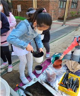 준비된 화분에 거름망을 깔고, 강낭콩을 심을 흙도 만져보며 관찰하였습니다. 모종삽을 이용하여 흙을 넣어준 다음, 물에 불린 강낭콩 씨앗을 직접 심어보았습니다. 물을 주는 친구들의 눈빛에 강낭콩이 싹을 틔워 쑥쑥 자라기를 바라는 마음이 보였습니다.