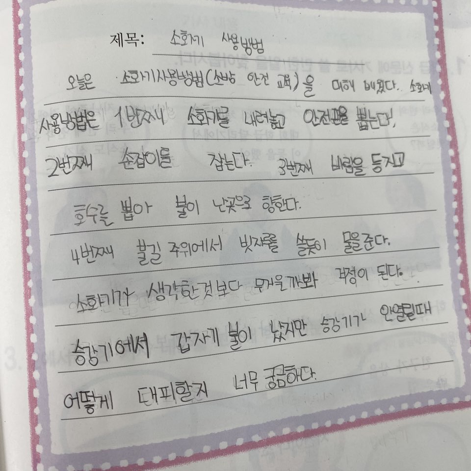 훈련에 참여한 6학년 학생은 “화재가 발생했을 때에는 엘리베이터가 아닌 계단을 이용해야 하며 119로 신고하고 소화기 사용법을 평소에 익히는 등 우리가 평소에 알고 있는 것을 잘 익힐 수 있어서 좋았습니다.”라고 소감을 밝혔습니다.