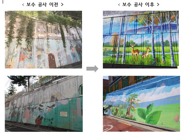서울정목초등학교(교장 이연호)에서는 2021년 3월부터 5월까지 이루어진 담장 벽화 보수 공사 사업이 성공리에 마무리 되었습니다.
