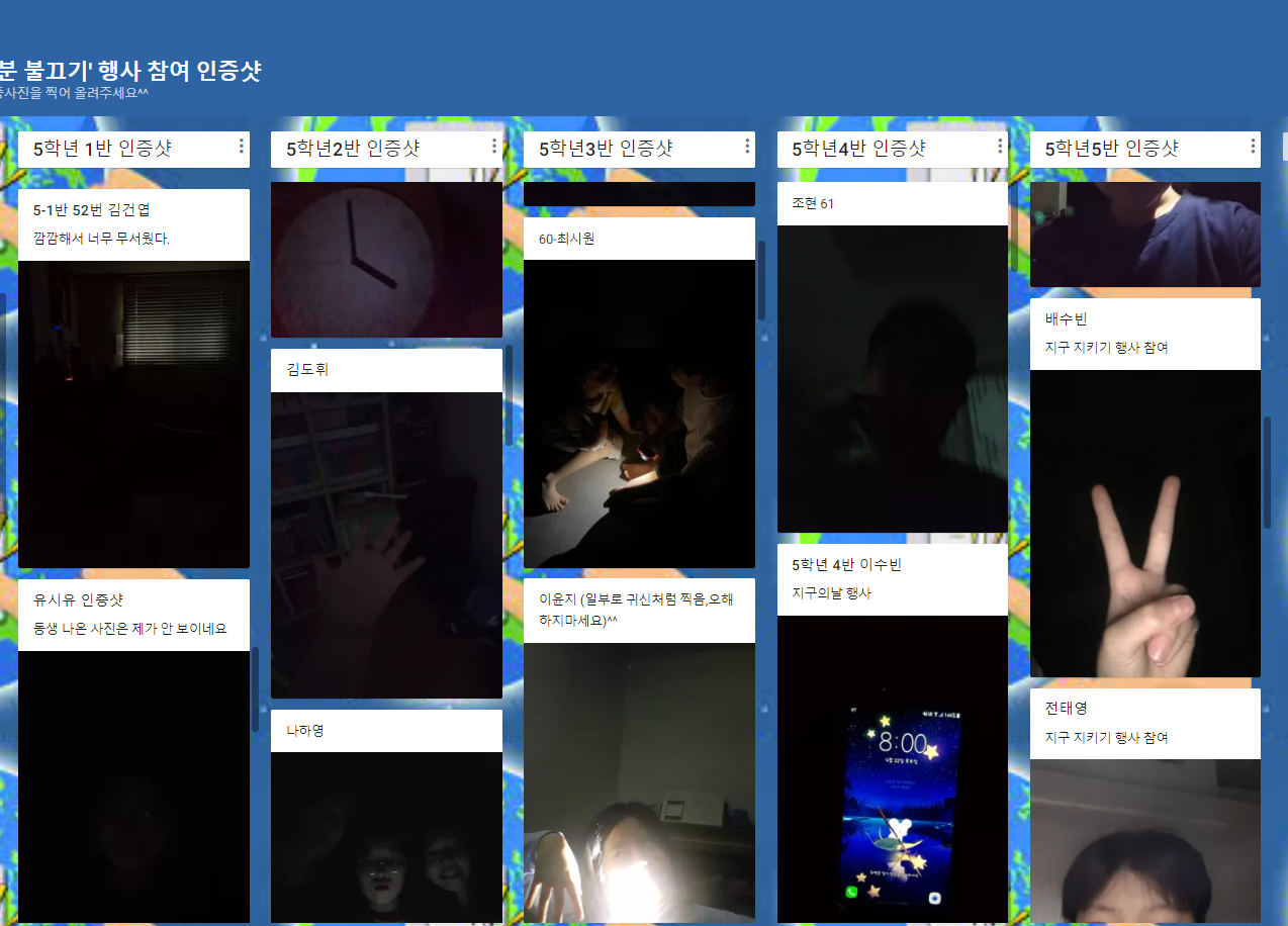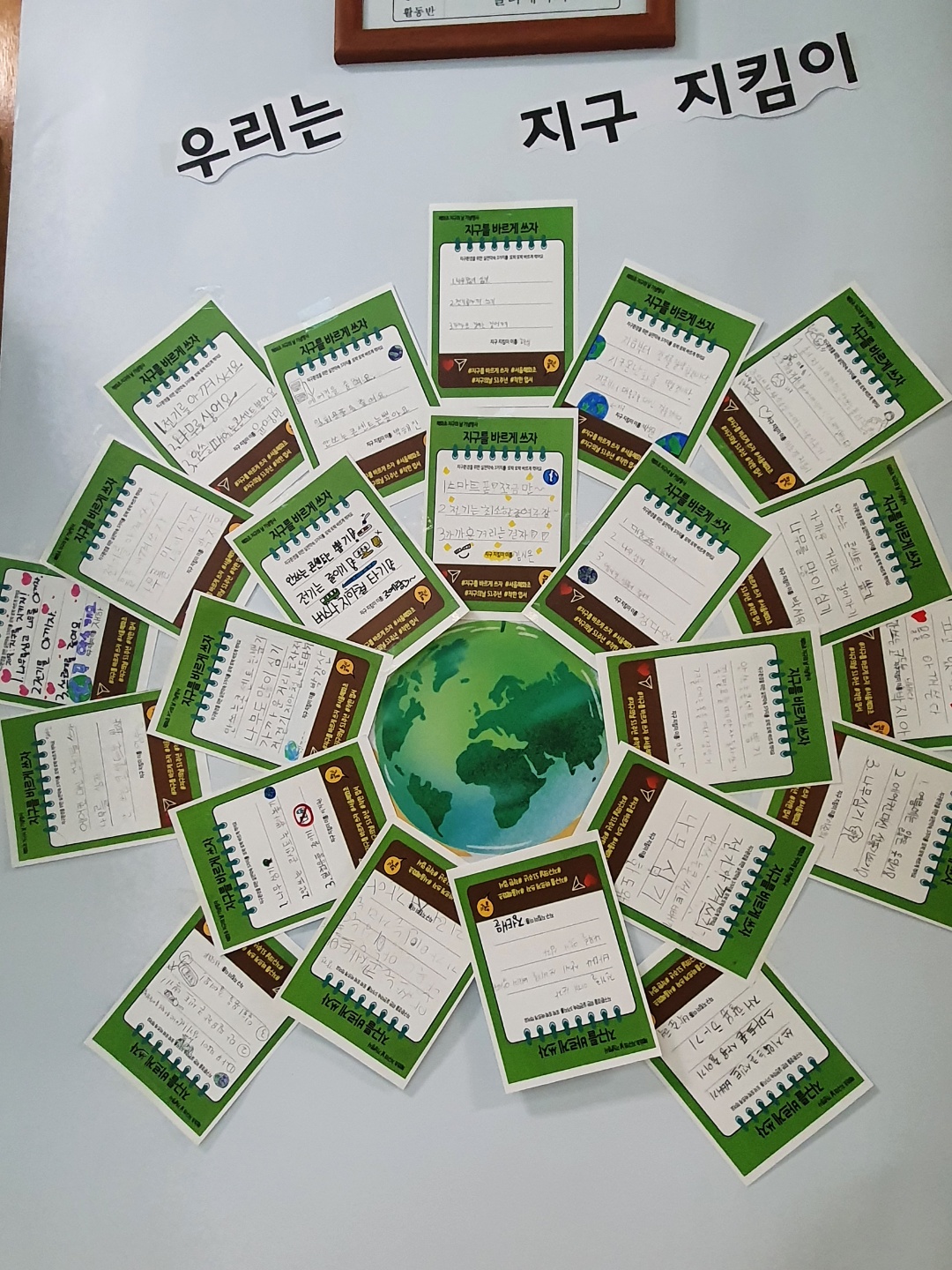 서울혜화초등학교(한경자)에서는 4월 22일 지구의 날에 저녁 8시부터 8시까지 10분간 지구를 위한 불끄기행사가 있었습니다. 사전행사로 1~4학년은 북극곰의 눈물, 5~6학년 지구를 지키는 20가지 제안, 영상을 보고 ‘지구를 바르게 쓰자’ 엽서쓰기 활동을 했습니다. 지구와 함께 인간, 동물, 식물이 오랫동안 살기위해서 우리 모두의 노력이 필요함을 알게 되었습니다. 드디어 지구의 날 저녁 8시가 되었습니다. 지구를 위한 착한 실천 인증사진 482개가 순식간에 올라왔습니다. 지구의 날 행사에 참여한 모든 학생들은 친환경 대나무칫솔을 받았습니다. 혜화초 여러분의 참여로 지구가 깨끗해졌습니다. 지구가 전해달라고 합니다. ‘혜화초 학생들 고마워요!’
